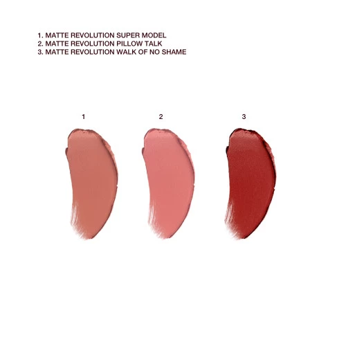 - Mini Matte Revolution lipstick in Walk of No Shame: The globally-loved, berry-rose, lip-enhancing hue that’s loved by supermodels and stars with a confidence-enhancing, cashmere-soft matte finish.
