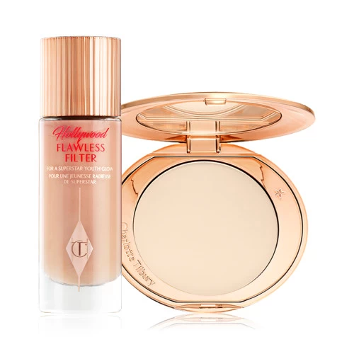 Pairing the light, luminous coverage of my ICONIC Hollywood Flawless Filter glow booster and the smoothing, blurring effects of my award-winning Airbrush Flawless Finish pressed powder, this complexion kit unlocks a magical saving of 10% off two of my most iconic beauty secrets – only on CharlotteTilbury.com*!