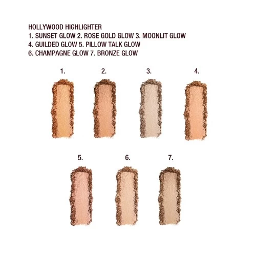 - Hollywood Glow Glide Face Architect Highlighter: Combining the rich pigment pay-off of a pressed powder with the skin-gilding satin texture of a liquid highlighter, my Hollywood Glow Glide Face Architect Highlighters ILLUMINATE, LIFT and SCULPT the LOOK of your SKIN without creasing, caking or settling into fine lines for a CONFIDENCE-BOOSTING GLOW! Glow like the STARS with my BEAUTY GLOW TRICKS, using on your cheeks, jawline, eyes, nose, brows and lips for a glowing, defined looking facial structure! Choose your shade from Champagne Glow, Pillow Talk Glow, Moonlit Glow, Gilded Glow, Rose Gold Glow, Bronze Glow or Sunset Glow!